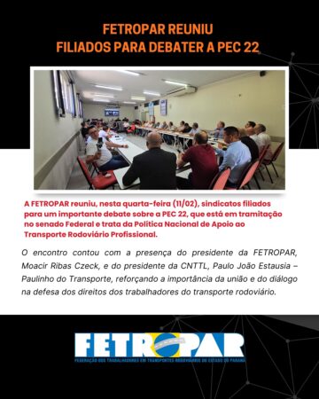 A FETROPAR reuniu, nesta quarta-feira (11/02), seus filiados para um importante debate sobre a PEC 22, que está em tramitação no Senado Federal e trata da Política Nacional de Apoio ao Transporte Rodoviário Profissional.